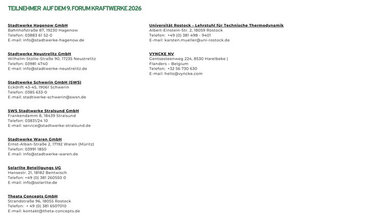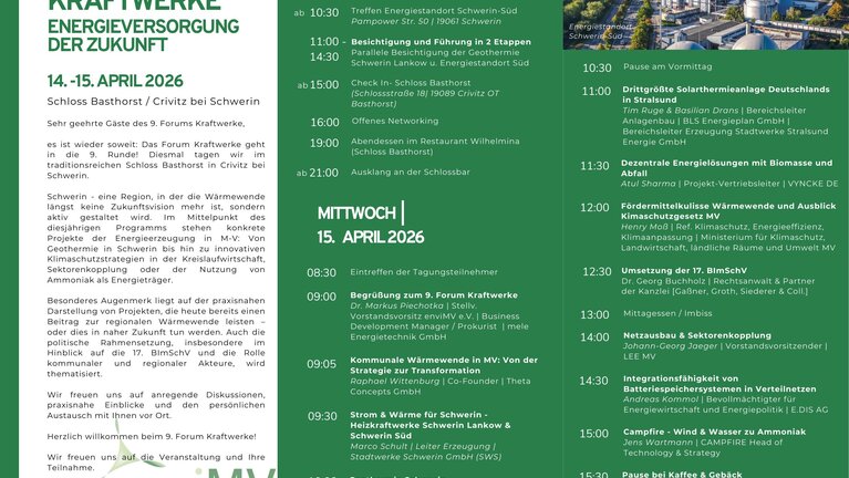 Im Namen des Vorstandes laden wir herzlich zum 9. Forum Kraftwerke ein, das am 14. und 15. April 2026 in Schwerin / Crivitz stattfindet.